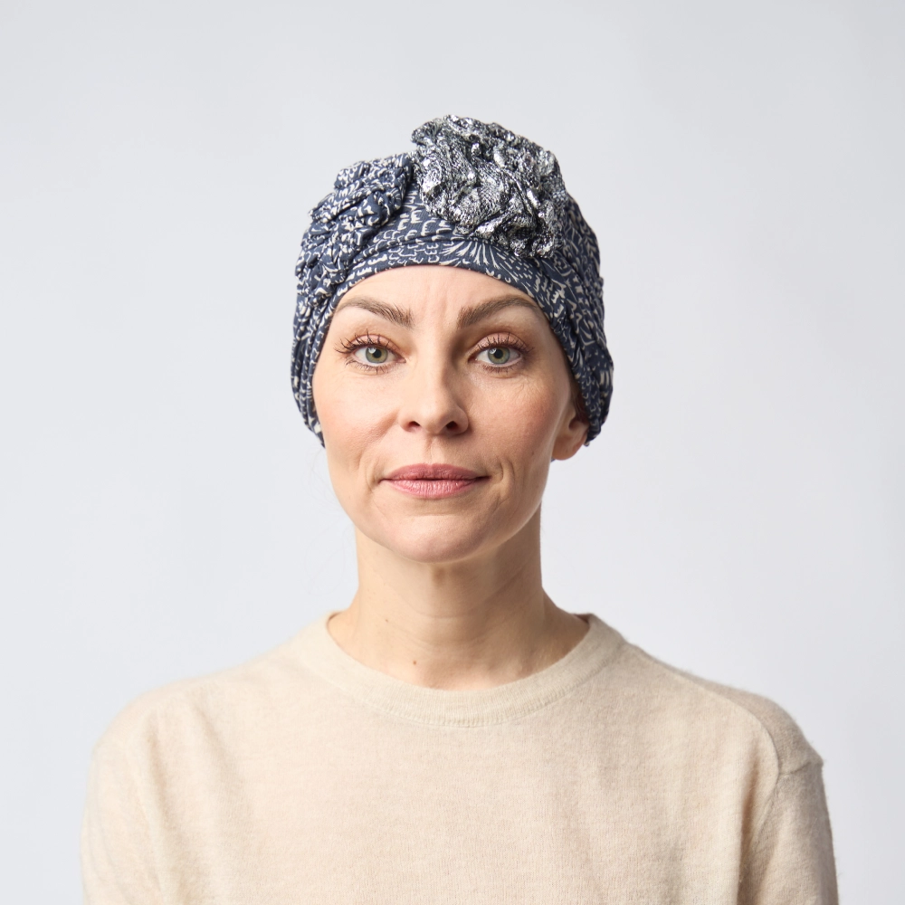 Confortevole turbante a cuffietta in viscosa di bamboo. Uno splendido copricapo con doppia applicazione floreale. Lo si può indossare da solo o sopra la parrucca per impreziosirla.